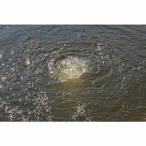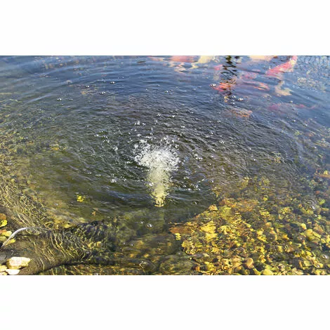 Combinaison dun puissant module solaire de 10 Wc et dun aérateur de bassin avec 5 puissantes sorties, chacune avec un tuyau de 3 m et une pierre à air chacune. Cela signifie que laération est également possible en plusieurs points de létang.