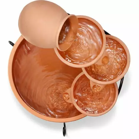 Le cadre en métal robuste assure un support sûr, tandis que les bols en terre cuite galbés individuels incarnent le style méditerranéen typique. Grâce à une pompe solaire de bassin efficace, le soleil se charge seul de lopération. Dès que suffisamment de lumière du soleil atteint le module solaire, la pompe commence à pomper de leau dans la cruche supérieure.