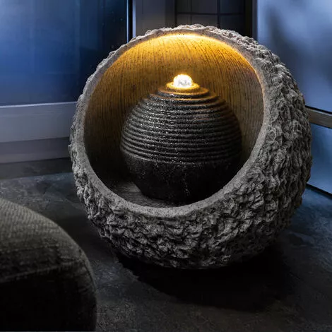 La fontaine dÂintĂ©rieur en polyrĂ©sine RockStone avec Ă©clairage LED est une fontaine dÂintĂ©rieur ronde et moderne qui donne Ă votre maison une ambiance Ă©lĂ©gante. LÂeau jaillit de lÂouverture Ă©clairĂ©e par LED de la pierre source et coule dessus dans la coque extĂ©rieure, qui en mĂȘme temps forme une grotte sĂ»re pour la pierre source. La fontaine intĂ©rieure est en polyrĂ©sine, une pierre artificielle de haute technologie moderne. La fontaine ressemble Ă une fontaine en pierre et lui ressemble trompeusement, mais elle est beaucoup plus lĂ©gĂšre et surtout beaucoup plus stable que la pierre lourde.