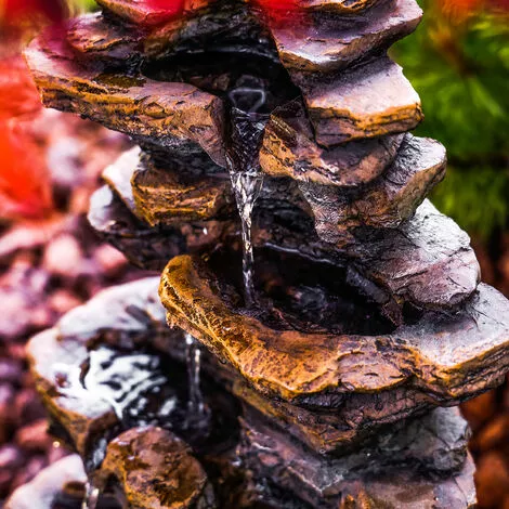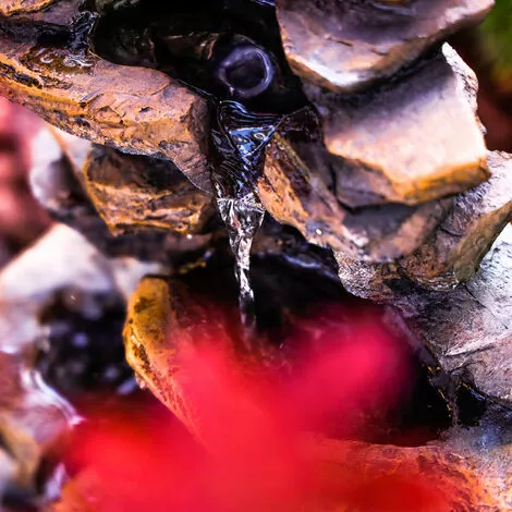Leau coule sur les pierres de la fontaine de la cascade du jardin Rock Fountain comme une véritable cascade et vous transporte avec le bruit déclaboussures silencieux directement dans les grands espaces. Le son apaisant de leau étouffe les bruits de fond indésirables ou les bruits de la rue simplement avec son clapotis silencieux. Sil fait chaud et sec en été, la fontaine en cascade fournit aux animaux du jardin de leau essentielle et offre aux oiseaux et aux insectes une boisson de bienvenue.