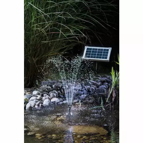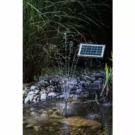 Des jeux deau et des effets de lumière enchanteurs en une pièce – sans frais délectricité : Le système de pompe à LED Solar Fountain 5/160 offre des jeux deau décoratifs dans votre bassin de jardin même après le coucher du soleil et les éclaire également avec une lumière LED. Une connexion secteur nest pas nécessaire – le chargement de la batterie par la lumière du soleil est suffisant.